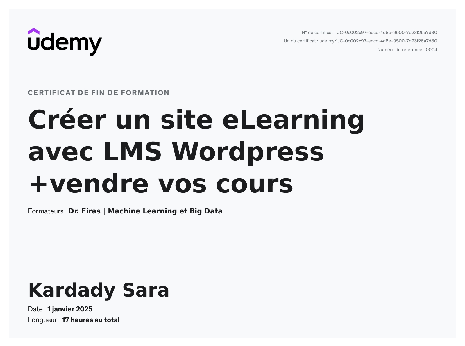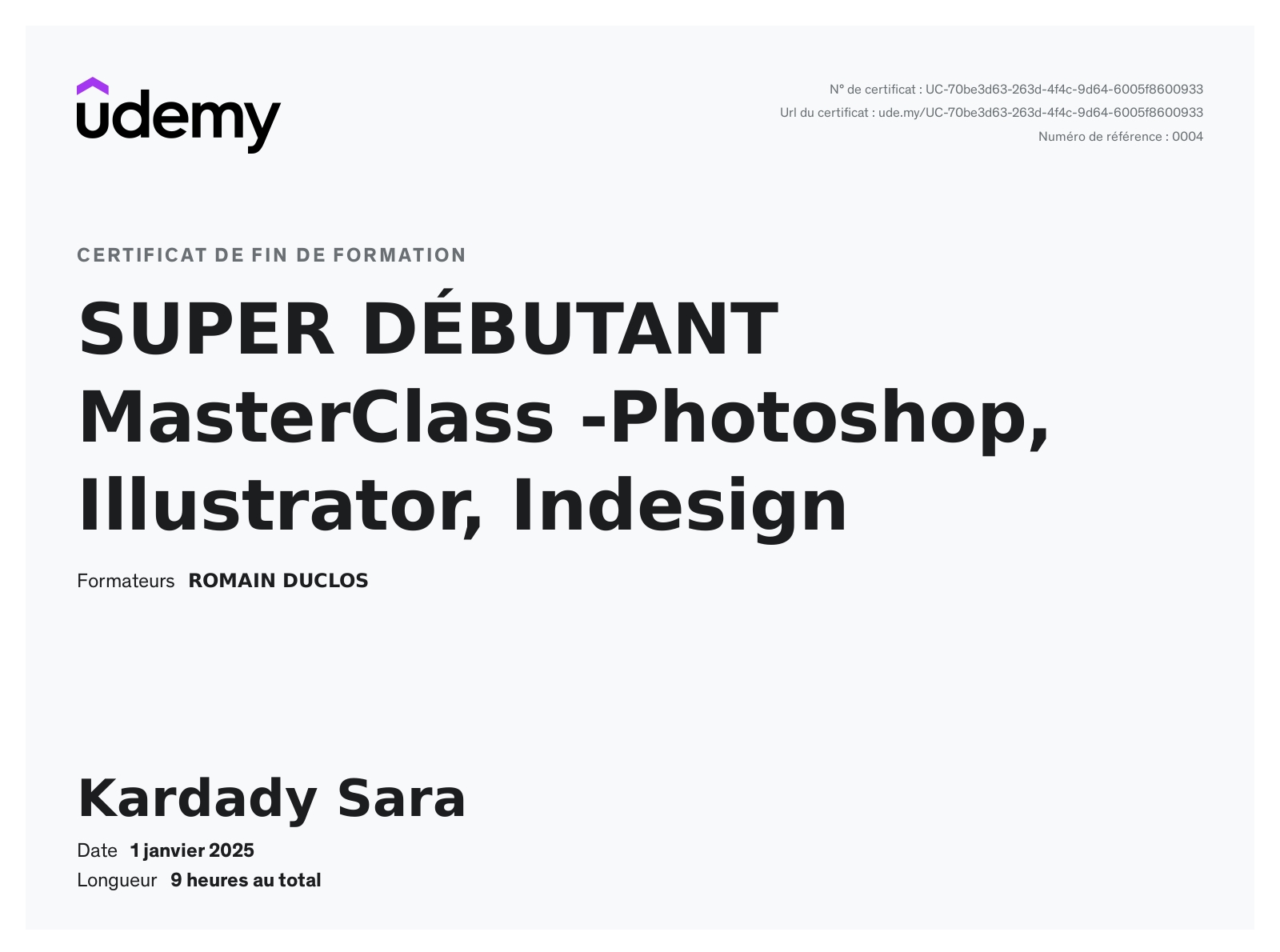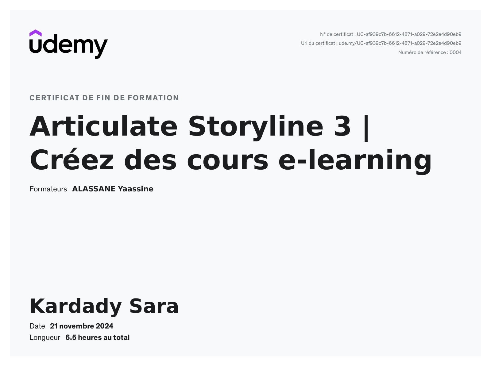 Ces certificats attestent de mes compétences solides dans l'utilisation d'outils essentiels tels que LMS WordPress, Photoshop, Illustrator, Indesign, et Articulate Storyline 3. Ils reflètent mon engagement à maîtriser les technologies et méthodologies nécessaires à la création de contenus e-learning interactifs et de supports visuels professionnels. Ces formations me permettent d'offrir des solutions pédagogiques innovantes et adaptées aux besoins des apprenants.