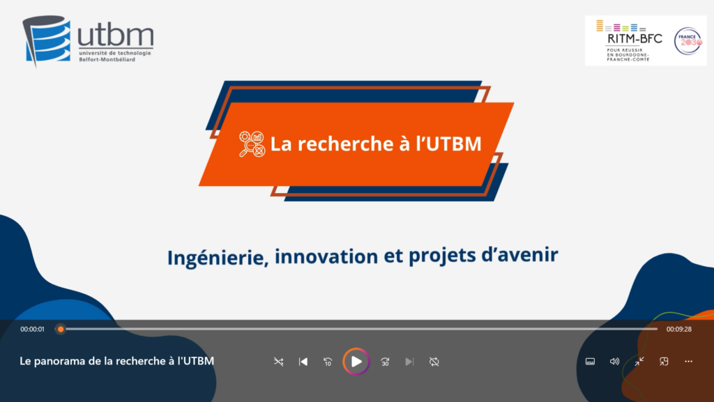 Cette vidéo propose une vue d’ensemble de la recherche à l’UTBM en présentant les pôles et laboratoires de recherche, les principales thématiques scientifiques, ainsi que les projets concrets menés par des doctorants et des enseignants-chercheurs. Réalisée dans le cadre d’un projet d’acculturation aux métiers de la recherche, elle vise à rendre la recherche plus lisible et accessible pour les étudiants ingénieurs.